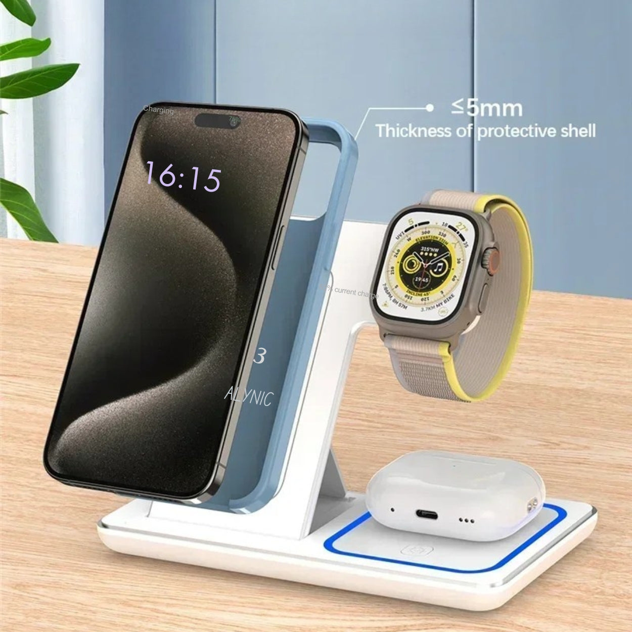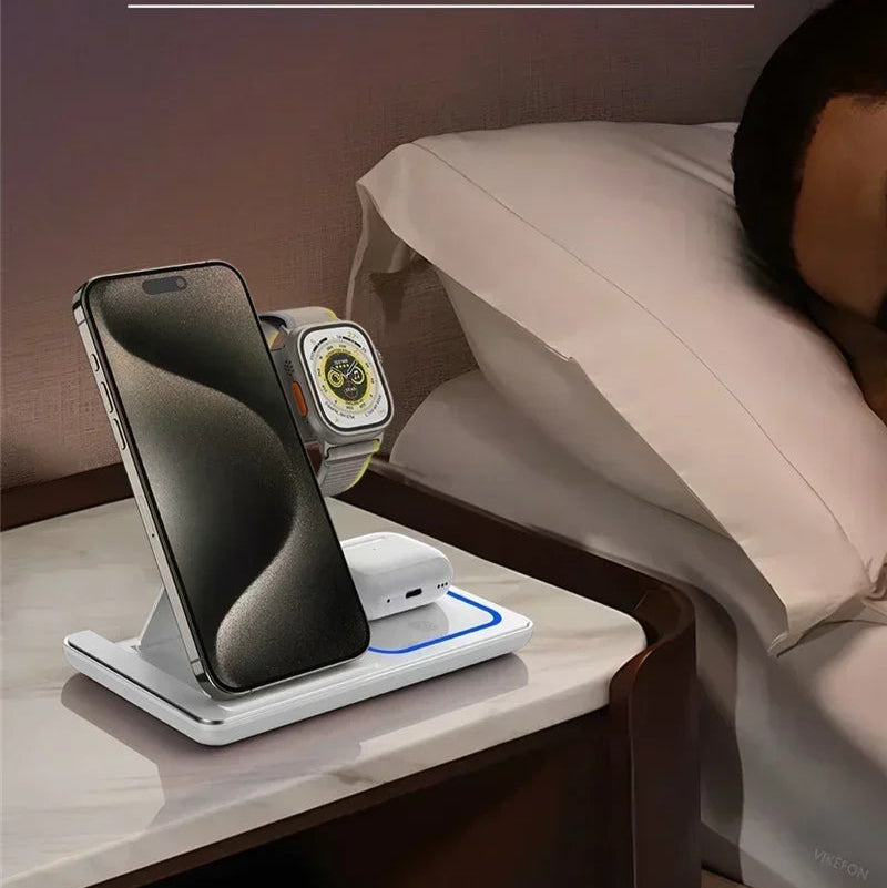 3-in-1 Fast Wireless Charger Stand – Foldable LED Charging Dock - Charge all your Apple devices in one sleek dock! This 3-in-1 wireless charger supports iPhone 12 to 16, Apple Watch Series 5–9, and AirPods Pro. Its foldable design saves space, while the LED indicator shows charging status at a glance. Perfect for your nightstand or office desk.